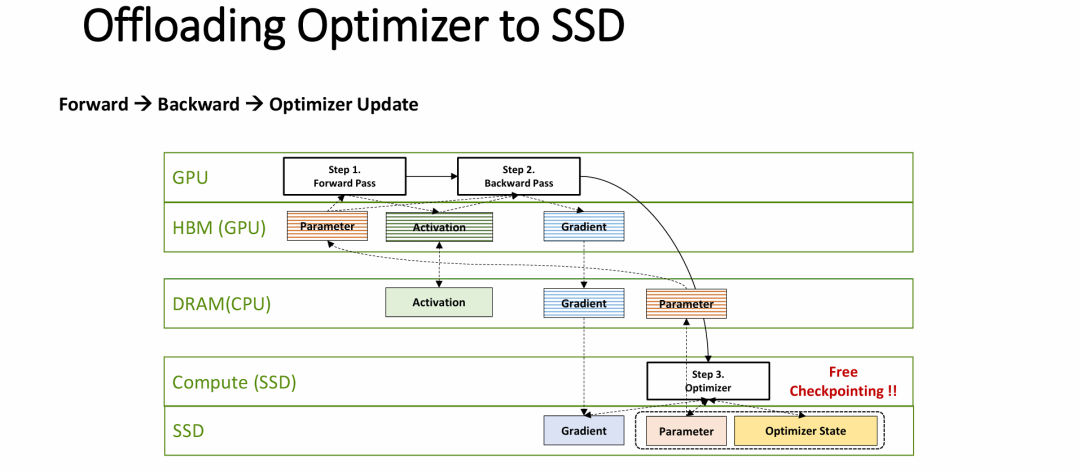 - 优化器卸载(Optimizer Offloading):该架构将消耗大量内存且计算模式相对固定(如逐元素操作)的“优化器更新”步骤,从昂贵的 GPU 转移到了具备计算能力的 SSD(如 SmartSSD)上。GPU 被完全解放,仅需专注处理计算密集型的前向和反向传播矩阵运算。