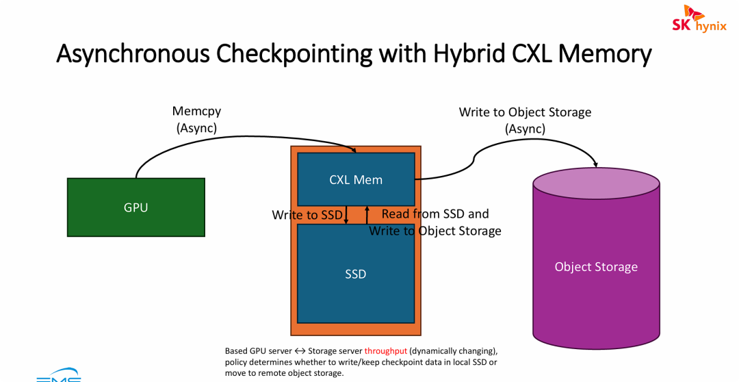 - 引入 CXL 内存打破容量墙:传统 CPU DRAM 容量有限且扩展昂贵。引入 CXL Mem(Compute Express Link 内存)后,系统获得了一个兼具“内存级极低延迟/高带宽”和“类似硬盘的可无限扩展容量”的超级缓冲池 。GPU 可以毫无顾忌地将海量 Checkpoint 数据瞬间卸载(Async Memcpy)到 CXL 内存中,彻底消除了显存阻塞和主机内存溢出的风险。