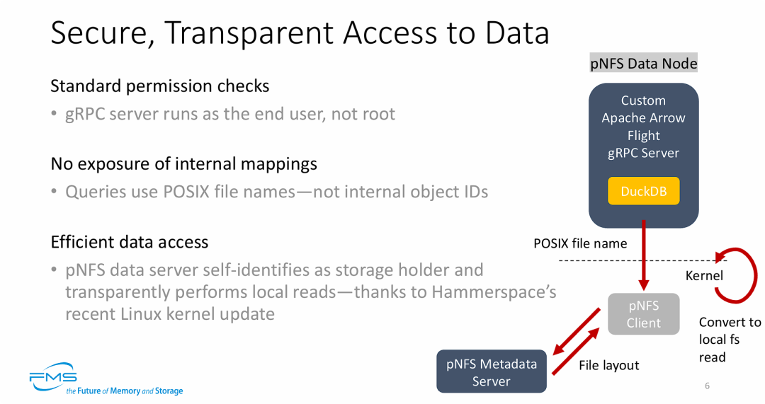 - 通过内核优化实现极致的“本地读取”效率:这是架构图展示的核心技术突破。当存储节点上的执行引擎(DuckDB)尝试读取同一台机器上的 pNFS 文件时,得益于特定的 Linux 内核更新,系统能够识别出该节点本身就是数据的物理持有者。因此,原本需要走网络协议栈的 pNFS 读取请求,在内核层被直接拦截并转换为极高效的“本地文件系统读取(Local FS Read)”,从而最大化了近存储计算的 I/O 性能优势。