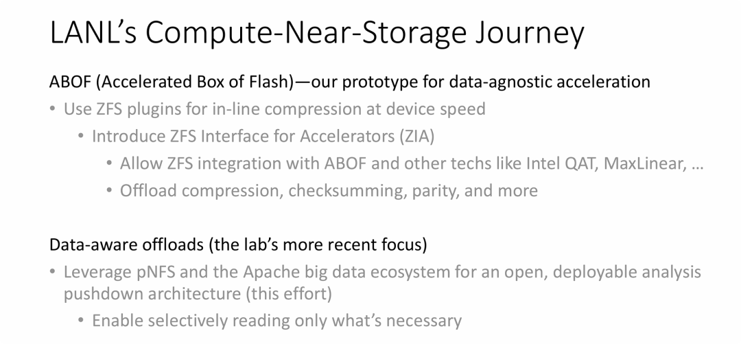 - 从“数据无关”的底层硬件卸载起步(Data-agnostic Offload): 早期阶段(ABOF),技术焦点集中在传统的存储协议层。通过开发 ZIA 接口,LANL 成功将 ZFS 文件系统中高度消耗 CPU 资源的底层通用操作(如内联压缩、数据校验、RAID 奇偶计算)卸载到专门的硬件加速器(如 Intel QAT)上。这种加速不关心存储的具体业务数据内容,主要目的是提升基础存储 I/O 性能和降低主机 CPU 开销。
