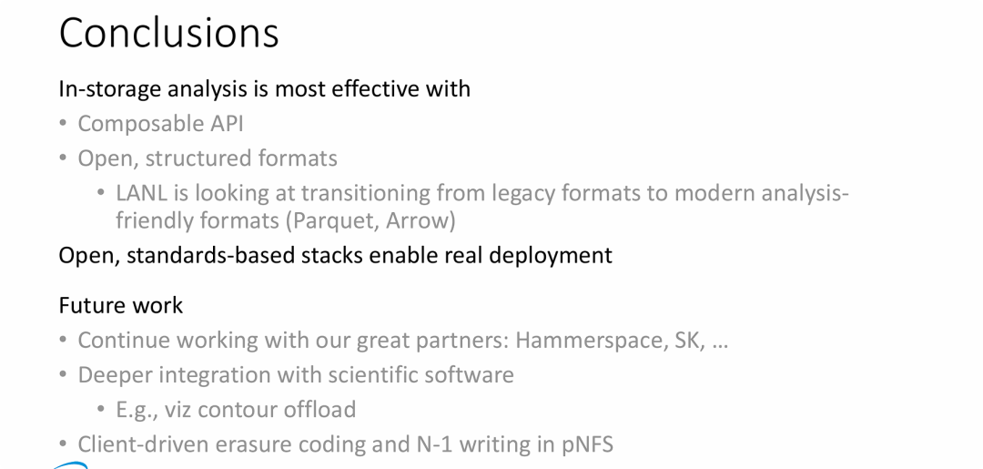 - 上层应用卸载将进一步深化:未来的工作不仅限于简单的 SQL 查询或数据过滤卸载,而是将向更复杂的科学应用层深入。例如“可视化轮廓卸载(viz contour offload)”,意味着将把图形渲染中极耗 CPU 和 I/O 资源的等值面提取/轮廓计算任务,直接下推到存储硬件中执行,这将极大提升 HPC 环境下的科学可视化效率。