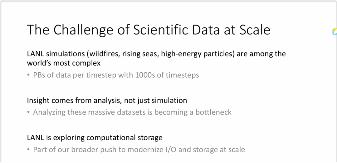 - 科学模拟正面临极端的数据爆炸:在高性能计算(HPC)场景下,复杂的科学模拟(如LANL运行的项目)在极短的时间步长内就能产生 PB 级别的超大规模数据,导致整体数据量呈指数级增长。