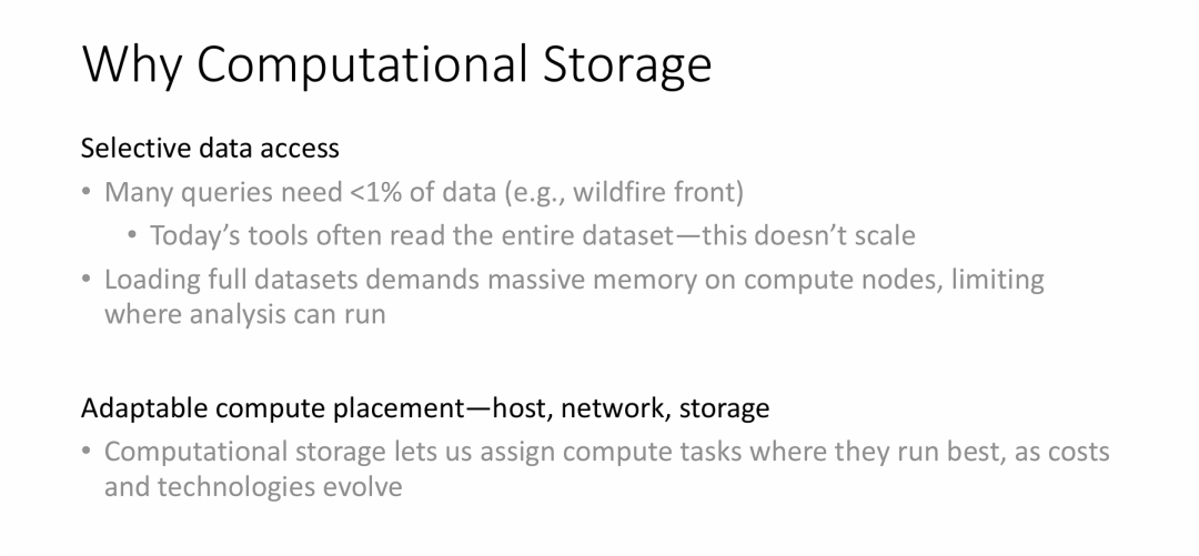 - 计算型存储(Computational Storage)被视为解决之道:为了打破上述由于海量数据移动和分析带来的 I/O 瓶颈,科研机构正在积极探索计算型存储(即将计算能力下沉到存储设备端,减少数据搬移),以此作为实现大规模存储架构现代化的关键策略。