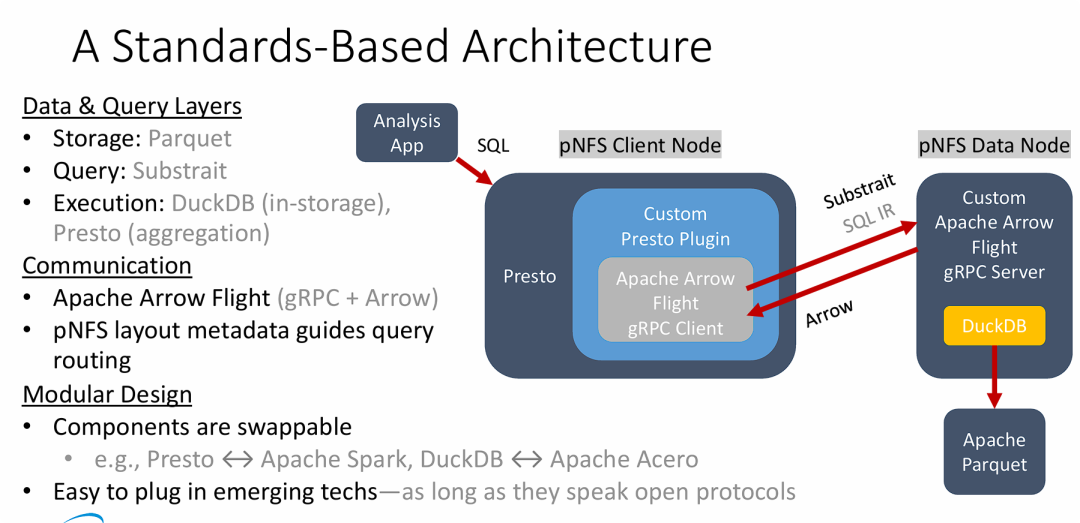 - 实现“近存储计算(In-storage Execution)”的完整数据流: 架构图清晰地展示了计算下推的实现机制。通过 Arrow Flight 和 Substrait,复杂的 SQL 查询意图被转换为中间表示(IR)下发到存储节点(pNFS Data Node)。在存储节点本地利用轻量级分析数据库(DuckDB)直接对 Parquet 文件进行处理,仅将计算后的高价值结果(Arrow 格式)返回给客户端,大幅降低了网络带宽消耗。