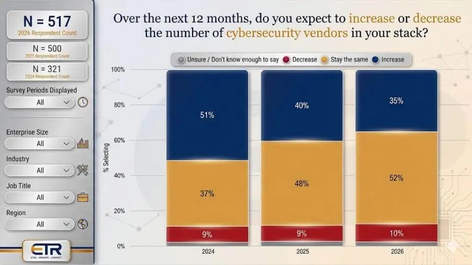 工具泛滥多年来一直是反复主题,ETR 数据仍反映减少安全堆栈中供应商的难度。下面红色“减少”条仍温和——约 10% 的受访者表示预计在未来 12 个月减少网络安全供应商。这变化不大。更意味深长的变化是预计 增加 供应商的比例从两年前的 51% 降至今天的 35%。这是“任务完成”,但表明疯狂采用闪亮新点工具的势头在放缓。