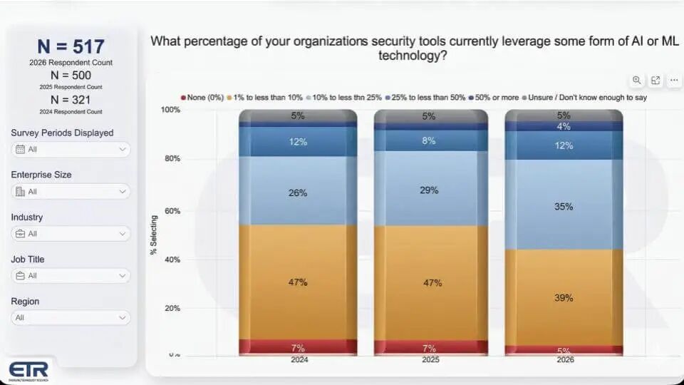 让我们快速转向企业技术研究(ETR)的 RSAC 前调查数据,这解释了为何 RSAC 2026 将感觉像 AI 大会,尽管采用仍不均衡。下面最新调查有 517 名受访者,问题是: 组织的安全工具中有多少百分比利用某种 AI 或 ML?
