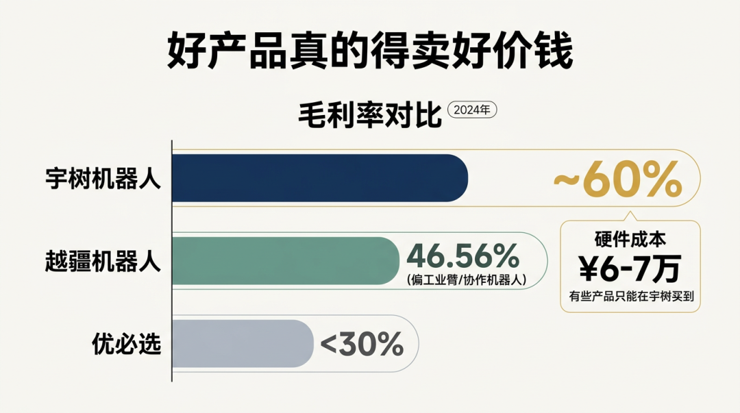 宇树机器人的招股书里把毛利率和另外两家也涉及人形机器人的公司做了对比。优必选2024年的毛利率不到30,越疆高一些,是46.56%。但越疆机器人相对来说是做偏工业的工业臂,以及协作机器人多一些,人形机器人占的整体业务比较少。