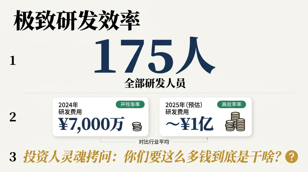 有多高呢?宇树机器人加起来只有175个研发人员。一年的研发费用,即使是今年到年底,估计也就一个来亿。去年一整年才7000万。这个数字还是非常夸张的。