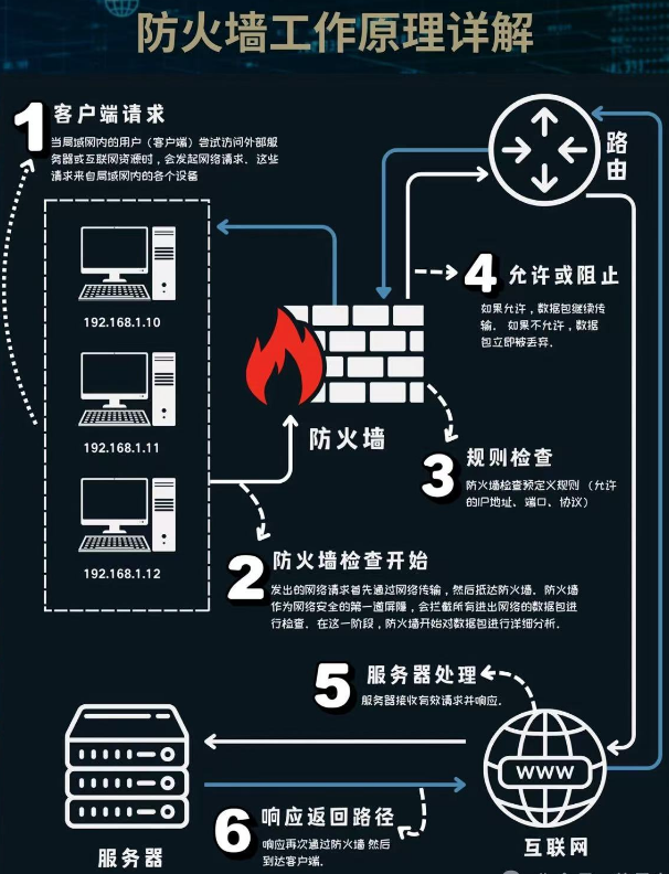 防火墙的本质是基于预设安全规则的流量过滤器,所有进出网络的数据包都必须经过它的检查,只有符合规则的流量才能通行,整个流程分为 6 个核心环节: