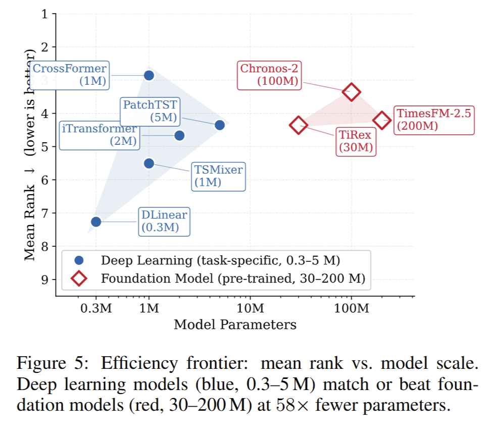 - 参数效率量化:证明深度学习模型(平均1.9M参数)可达到或超越基础模型(平均110M参数)性能,参数效率优势达59倍,且随预测范围增长退化更平缓