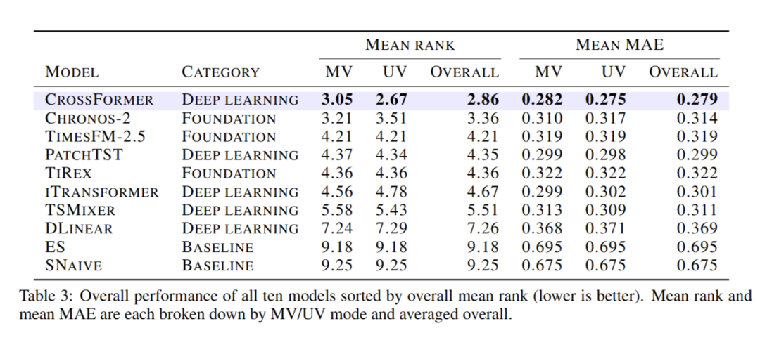 - 整体性能基准实验:在全部评估实例上对比 10 个模型的综合表现,CrossFormer 取得最佳排名与最低 MAE,Chronos-2 为基础模型中最优,统计基线显著落后(对应表 3),验证了基准的区分度。