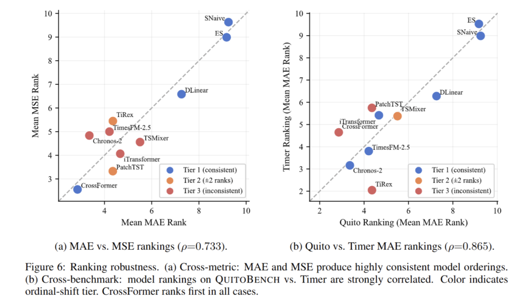 - 排名稳健性验证实验:验证跨指标与跨基准的排名一致性,MAE 与 MSE 排名高度相关,QUITOBENCH 与 Timer 基准排名也显著相关(对应图 6、表 19、表 20),证明实验发现的普适性。