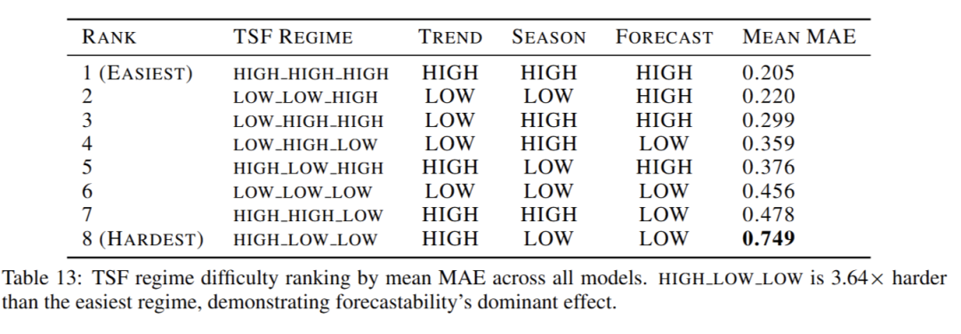 - 可预测性是核心难度驱动因素:不同状态间的平均绝对误差(MAE)差距达 3.64 倍,凸显可预测性对预测难度的决定性影响。