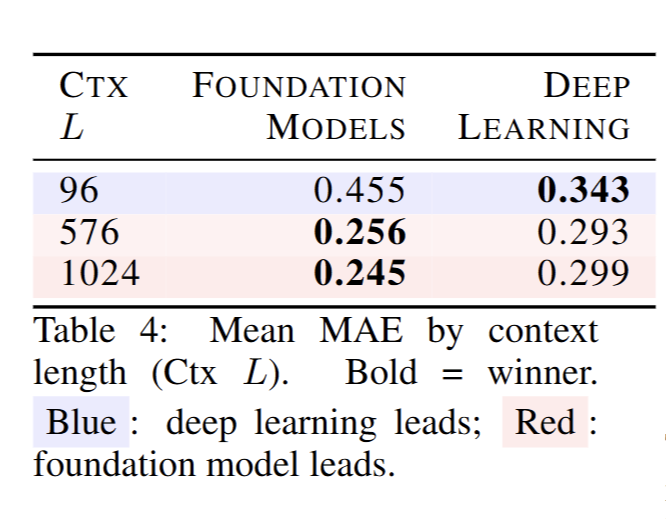 - 上下文长度交叉点:发现深度学习模型在短上下文()领先,但基础模型在长上下文()反超,为"何时使用基础模型"提供明确阈值