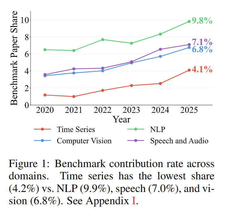 - 领域对比:论文指出与计算机视觉(ImageNet、COCO)、自然语言处理(GLUE)和语音处理(LibriSpeech)等领域相比,时间序列领域缺乏统一的基准生态系统,其基准论文占比最低(4.2% vs. NLP的9.9%)。