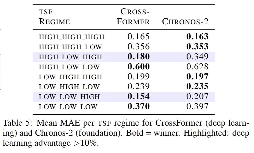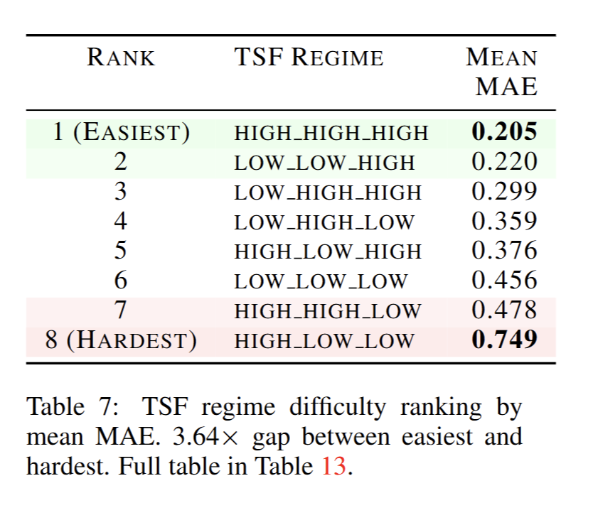- TSF Regime 分析实验:在 8 个 TSF(趋势 × 季节性 × 可预测性)regime 上分解模型行为,可预测性为难度主导因素,不同 regime 间难度差距显著,基础模型在高季节性或高可预测性 regime 占优,深度学习在低季节性 regime 领先,HIGH LOW LOW 为病态 regime(对应图 2、表 5、表 7)。