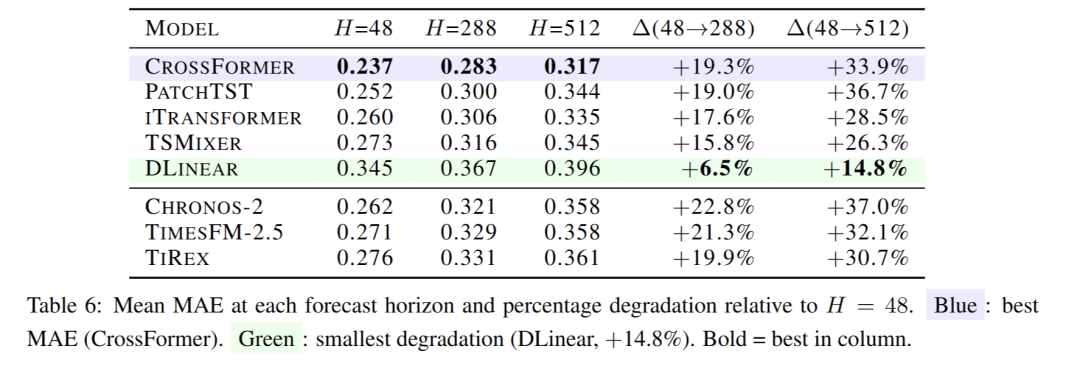 - 预测范围稳健性实验:分析模型在不同预测范围内的性能退化情况,深度学习模型退化率低于基础模型,DLinear 退化最平缓但基线 MAE 较高,CrossFormer 在各范围均保持最低绝对 MAE(对应表 6),体现任务特定架构对长程预测不确定性的稳健性。