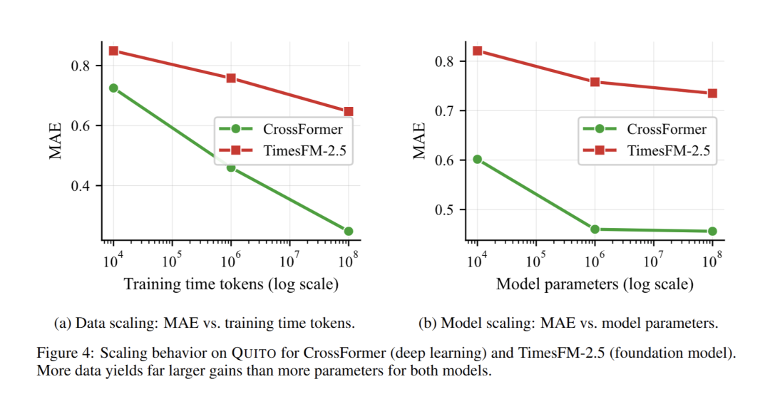 - 数据vs模型扩展法则:发现对两类模型,增加训练数据量(从10K到100M tokens,MAE降低66%)比增加模型规模带来的收益更大,指导资源分配决策