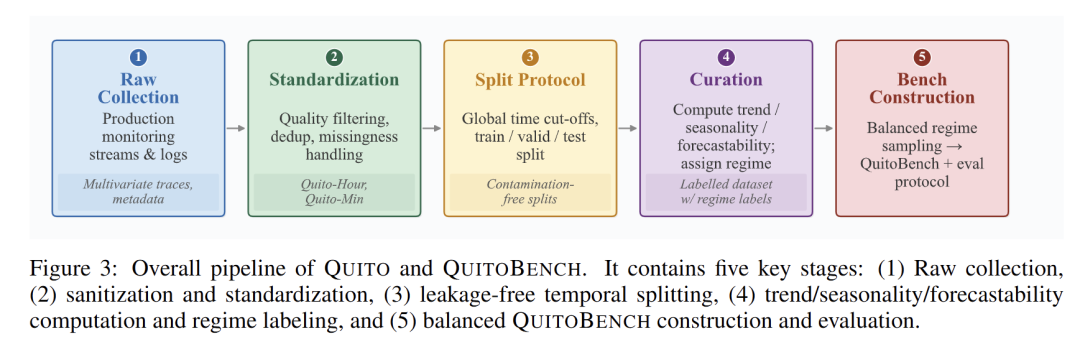 为应对上述挑战,论文提出了QUITO(一个来自支付宝生产平台的十亿级单来源时间序列语料库)和QUITOBENCH(首个在八个TSF regime上实现近均匀覆盖的regime平衡基准测试)。该设计通过基于内在统计特性(趋势、季节性、可预测性)的分类、无泄露的时间分割、统一的长序列支持,以及受控的数据扩展能力,实现了对深度学习模型、基础模型和统计基线的严格评估,并揭示了上下文长度交叉点、regime专业化、参数效率和数据扩展等关键发现。