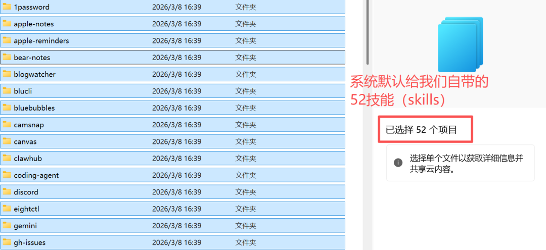 二、内置核心 Skill 分类(2026.3.7 版本)