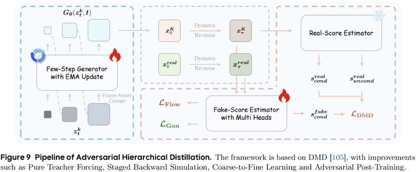 更狠的是,他们引入了“对抗性层次蒸馏(Adversarial Hierarchical Distillation)”技术,仅使用自回归模型作为教师,将采样步数从传统的 50 步直接砍到了 3 步。