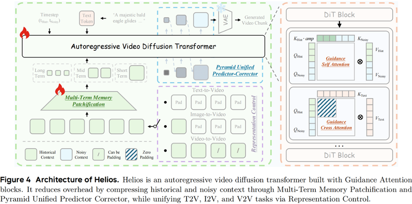 六边形战士:长短视频双杀,T2V/I2V/V2V 全能 Helios 是一个原生支持多种任务的全能选手。通过统一的输入表示控制,如果历史上下文全为零,模型就执行文本生成视频(T2V);如果只有最后一帧非零,就执行图生视频(I2V);否则执行视频生成视频(V2V) 。