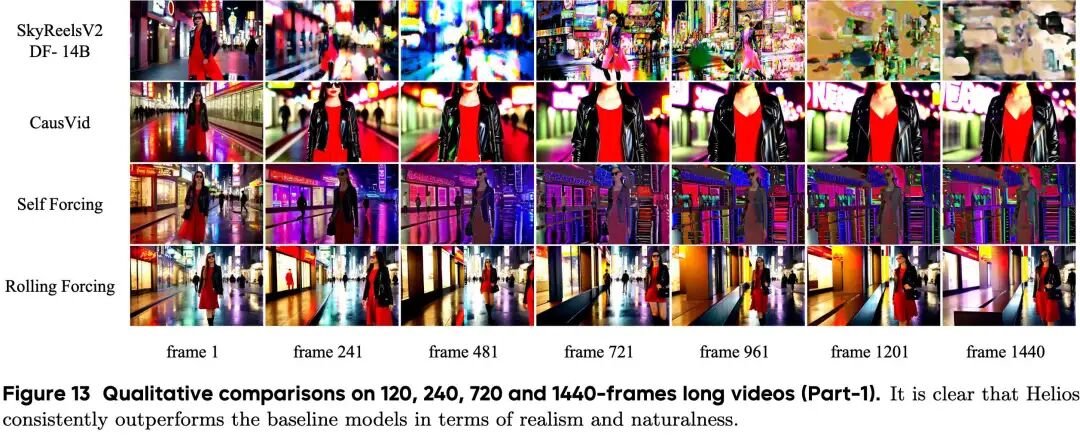 为什么说 Helios 是一次颠覆?因为目前社区里号称能做到“实时无限生成”的方法,大多只能依赖 1.3B 级别的小模型(比如基于 Wan2.1 1.3B) 。小模型的容量限制了它们表达复杂运动的能力,往往会导致高频细节模糊 。