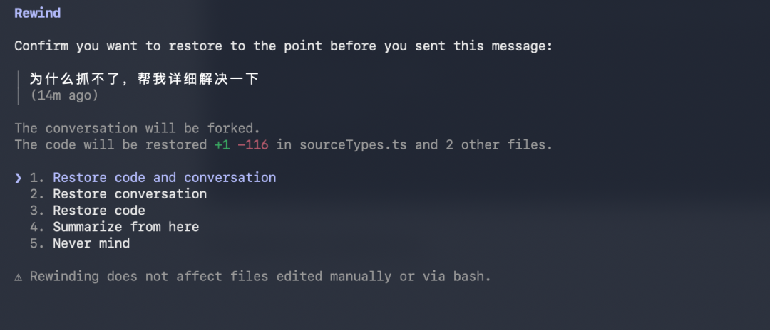 而现在,打/rewind会弹出菜单让你选,是只回退代码还是只回退对话。