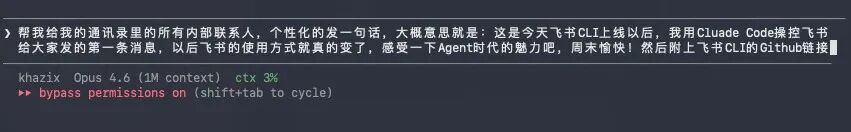 帮我给我的通讯录里的所有内部联系人,个性化的发一句话,大概意思就是:这是今天飞书CLI上线以后,我用Cluade Code操控飞书给大家发的第一条消息,以后飞书的使用方式就真的变了,感受一下Agent时代的魅力吧,周末愉快!然后附上飞书CLI的Github链接。