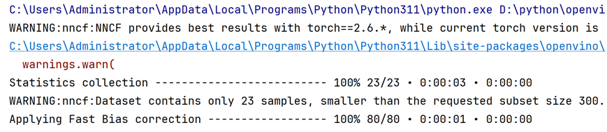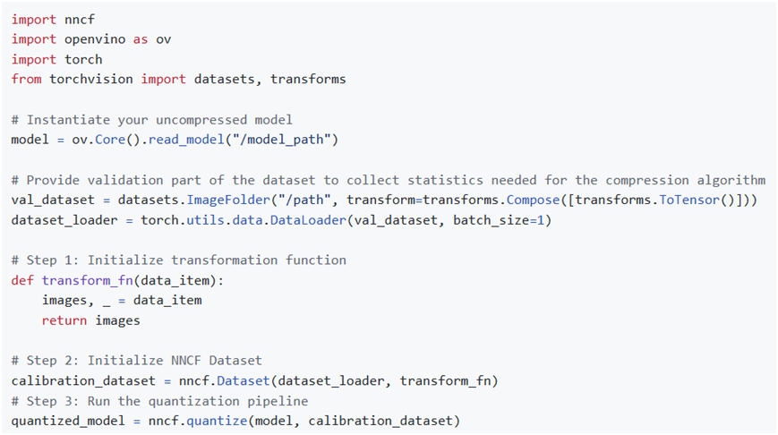 https://github.com/openvinotoolkit/nncfNNCF PTQ 是最简洁的INT8量化方法,只需要模型和一个小的 (~300 个样本) 校准数据集即可实现对模型的INT8量化。对训练后的模型转为IR格式以后用,OpenVINO的NNCF框架把模型量化为INT8模式。PTQ的量化代码如下: