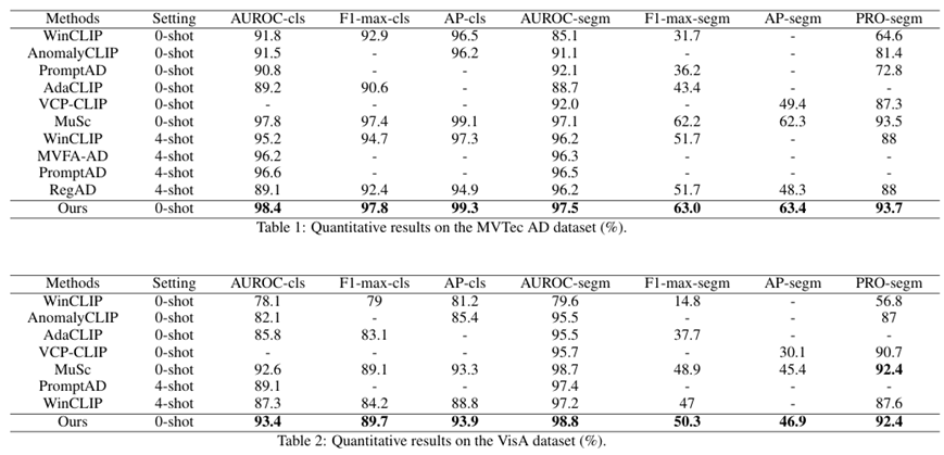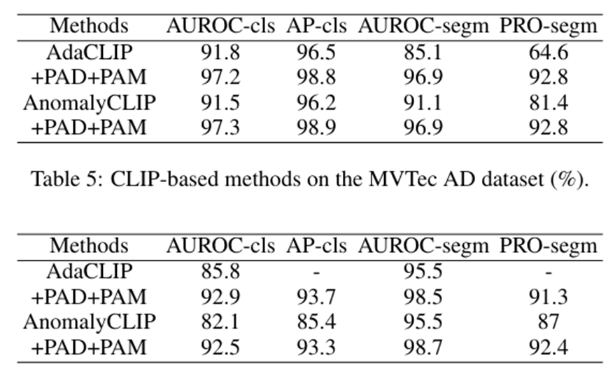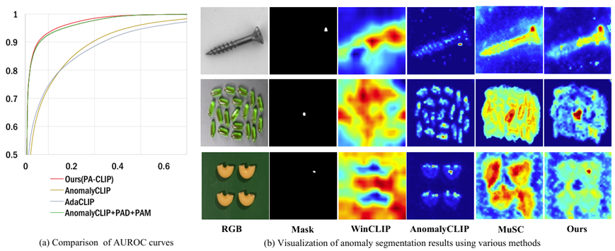 在MVTec AD、VisA等基准数据集上PA-CLIP性能完全超越已经存在的其它零样本缺陷检测模型,证明它是一种工业缺陷异常检测稳定解决方案。