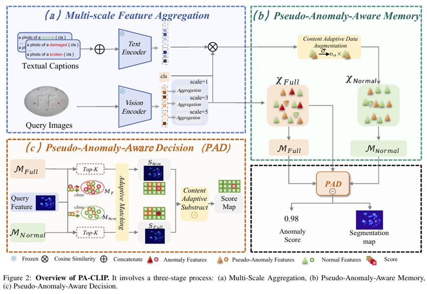PA-CLIP作为零样本异常缺陷检测模型通过提取多尺度特征实现局部与整体特征聚合;通过两个记忆银行(正常样本与伪装异常)策略实现背景信息与真实样本特征区分;通过要给决策模块实现因环境因素影响导致的假阳性降低到最小。