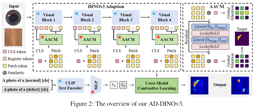 我们采用DINOv3作为AD-DINOv3的视觉主干网络。如图2所示,图像分支会提取图像块标记和一个CLS标记,这些标记通过轻量级适配器与异常感知校准模块共同进行优化处理。