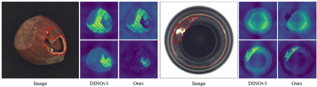 异常感知校准模块(AACM)在掩码监督的引导下,显式地将CLS标记的注意力聚焦于异常图像块区域,使其全局关注点从自然图像预训练中常见的通用前景对象转向异常特征。与此同时,文本分支通过对正常与异常提示语(例如“一张[状态][类别]的照片”)进行编码,并同样经过适配器优化以更好地适应目标领域。在异常定位过程中,系统通过比照图像块标记与提示嵌入向量来生成像素级异常热力图。