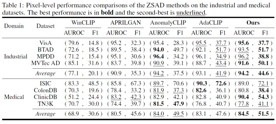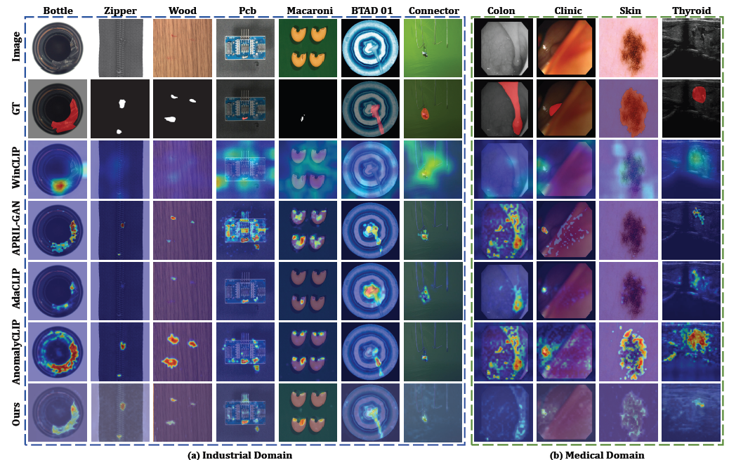 在八个工业与医疗基准数据集上超越或媲美现有最先进方法,证明了其作为通用零样本异常检测框架的有效性。