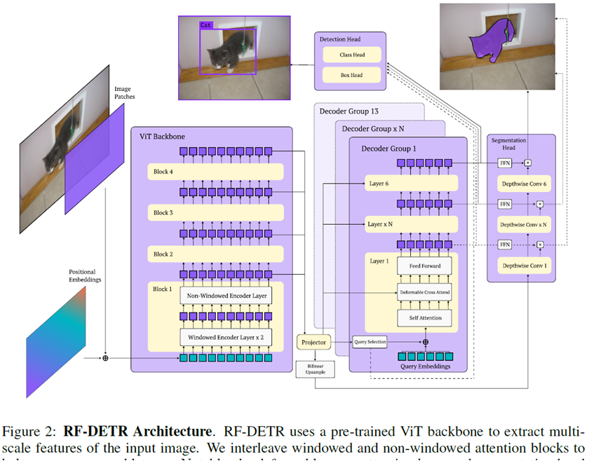 1. RF-DETR采用预训练的ViT骨干网络来提取输入图像的多尺度特征。