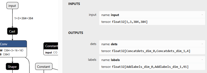支持导出ONNX格式模型,以RFDETR NANO模型为例,导出的模型输入与输出数据格式如下: