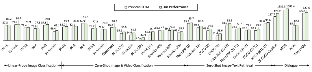 它是迄今为止最大的开源视觉/视觉语言基础模型(14B),在视觉感知、跨模态检索、多模态对话等广泛任务上实现了32项最先进的性能。是绝对的开源最能打的多模态与视觉语言模型(VLM)。