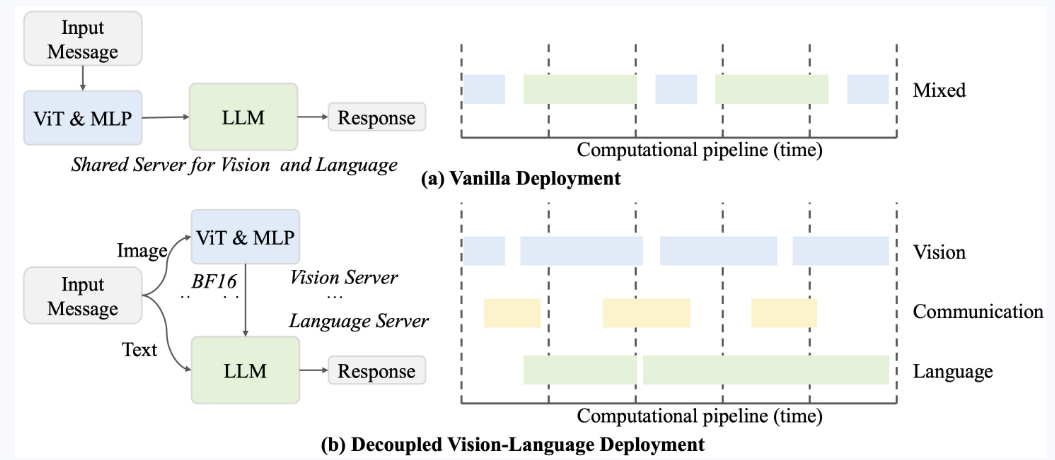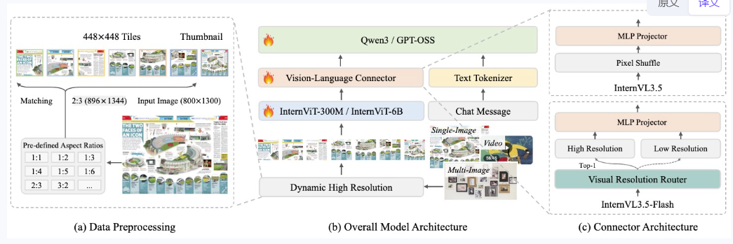 为了优化效率,我们提出了 视觉分辨率路由器 (ViR),它可以动态调整视觉 token 的分辨率而不影响性能。结合 ViR,我们的解耦 视觉-语言部署 (DvD) 策略将视觉编码器和语言模型分离到不同的 GPU 上,有效地平衡了计算负载。这些贡献共同使 InternVL3.5 在整体推理性能上比其前身(即 InternVL3)提高了 +16.0%,并且推理速度提高了 4.05 倍。