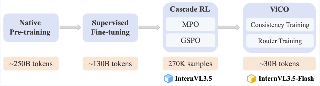 我们的训练流程包括四个阶段:多模态持续预训练(CPT)、监督微调(SFT)以及级联强化学习(CascadeRL)。在级联强化学习中,我们首先在离线强化学习环境下使用混合偏好优化(MPO)对模型进行微调,然后在在线强化学习环境下使用GSPO。 对于InternVL3.5的闪存版本,我们还引入了一个轻量级训练阶段,称为视觉一致性学习(ViCO),这减少了表示图像块所需的token成本。