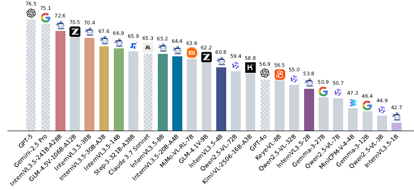 此外,InternVL3.5 支持诸如 GUI 交互和具身代理等新功能。值得注意的是,我们最大的模型,即 InternVL3.5-241B-A28B,在通用多模态、推理、文本和代理任务中取得了开源 MLLM 中的最佳结果——缩小了与领先商业模型(如 GPT-5)之间的性能差距。