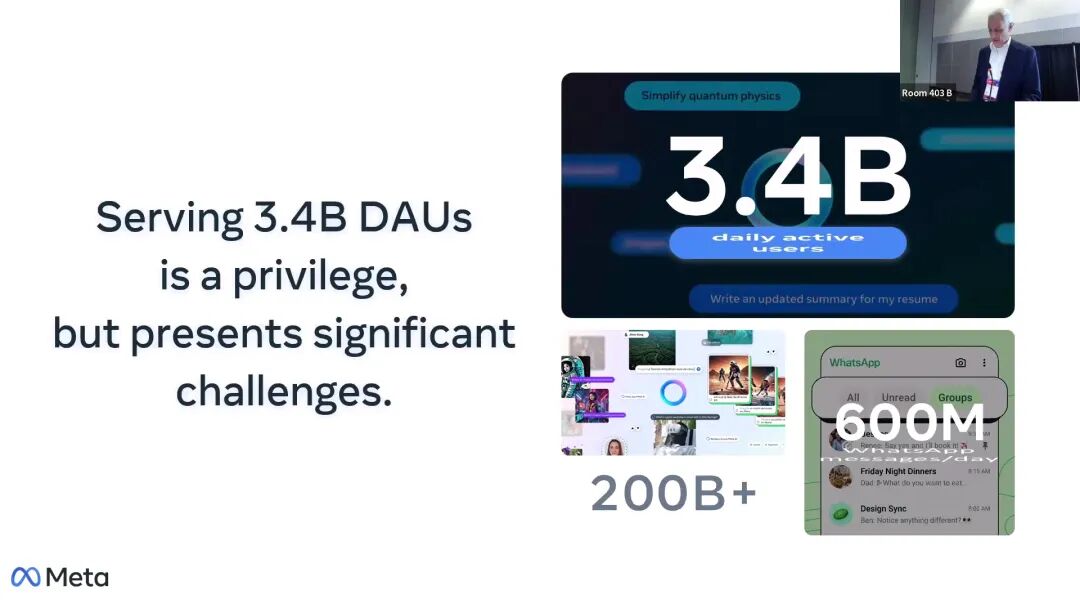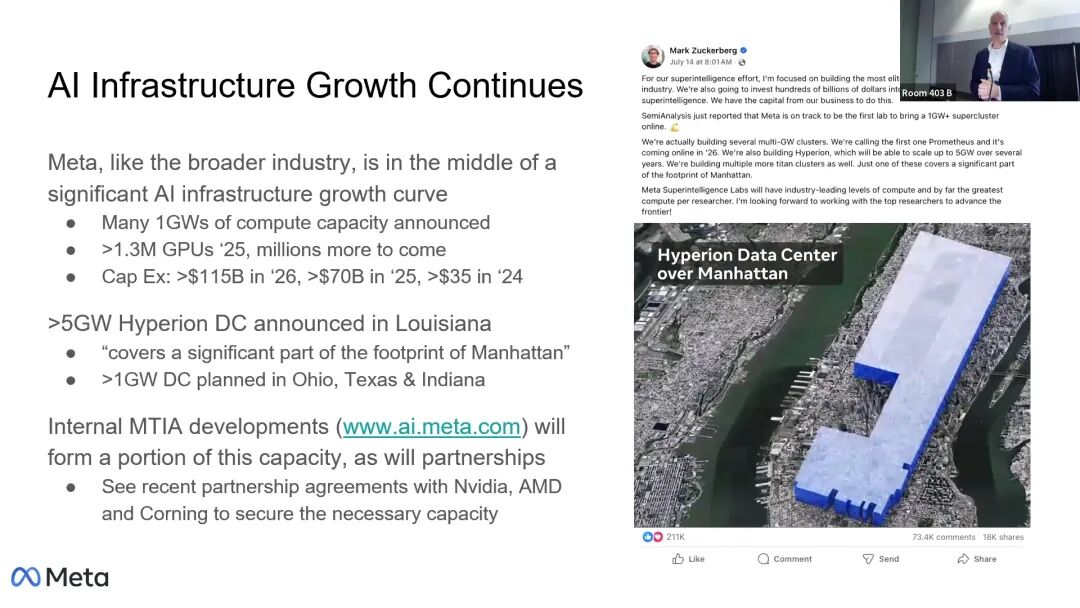 Meta全球平台拥有34亿日活跃用户,其业务稳定运行高度依赖AI基础设施的可靠性、性能与成本效益。当前Meta正处于AI基础设施爆发式增长周期:2025年已部署超130万H100等效GPU,未来还将新增数百万片;资本开支从4年前的350亿美元增长至2025年的700亿美元,2026年目标超1150亿美元;已发布路易斯安那州Hyperion数据中心,建成后总功率达5GW,占地面积相当于曼哈顿的显著区域,同时在俄亥俄州、得克萨斯州、印第安纳州规划了多个1GW级数据中心。