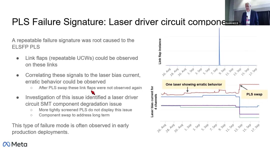 1. 主导故障来源:PLS模块激光驱动电路SMT组件退化:该故障为Phase1系统的核心故障来源,典型故障特征为:出现可重复的链路抖动与不可纠正码字,可关联到对应ELSFP光子层(PLS)模块的激光偏置电流异常波动。经与合作伙伴联合分析,根因为PLS模块激光偏置电路中的一个SMT组件出现性能退化,属于可通过设计优化解决的非根本性缺陷,并非CPO集成架构的固有问题;重新设计剔除该缺陷组件的PLS模块,以及经过严格筛选的PLS模块,均未出现此类故障。