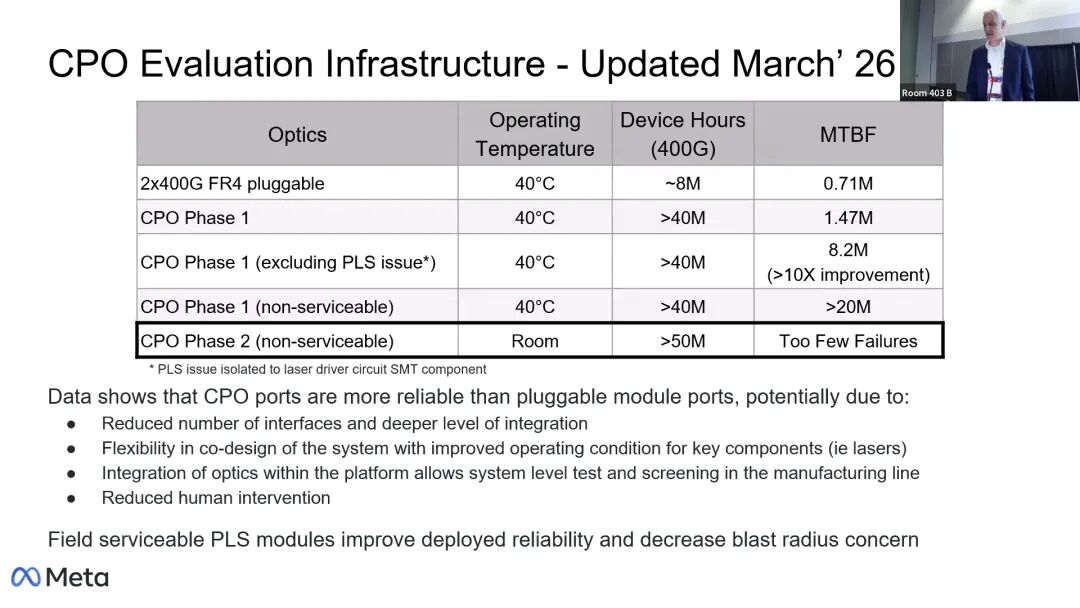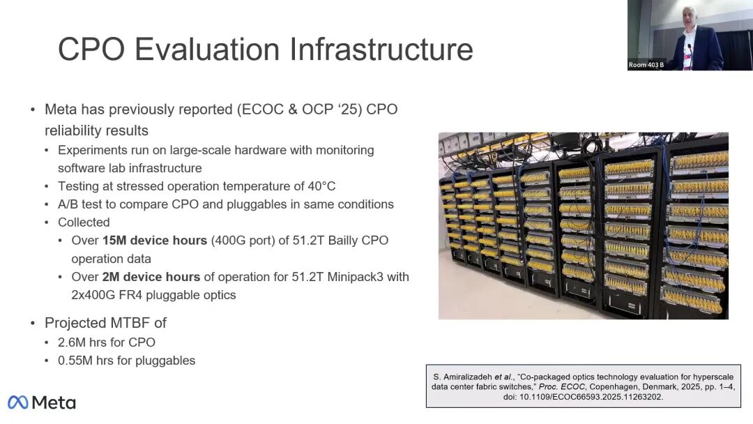 共封装光学(CPO)技术将光学IO与交换机芯片紧密集成,可大幅减少电通道损耗、支持更高的端口密度,是突破数据中心网络能效瓶颈的核心方案。但该技术的可靠性、可用性与可服务性(RAS)长期缺乏大规模实测验证,这也是Meta连续两年在行业顶会发布测试成果的核心聚焦点。