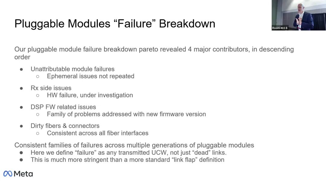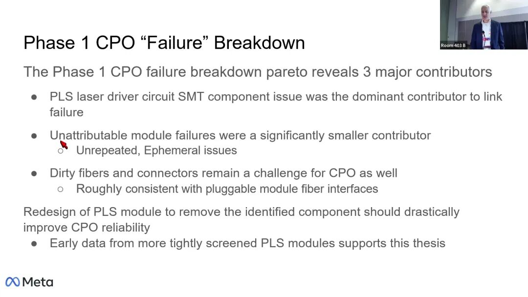 1. 针对观众提出的“测试对比的光学类型、以及可插拔模块SNR更高但故障更多的原因”问题,Meta回应称,本次对比测试的CPO与可插拔模块均采用FR4光学方案。可插拔模块故障更多的核心原因,一方面是不可复现的瞬时问题在故障占比中权重很高,同时各类制造相关的问题,比如组件、胶水、贴片工艺等带来的缺陷,都会带来额外的故障点,符合“组件数量越多,潜在故障点越多”的基本逻辑;另一方面,可插拔模块配套的多源DSP与固件也是故障的重要来源。同时,CPO方案减少了重定时器对应的DSP环节,也是可靠性提升的潜在因素。