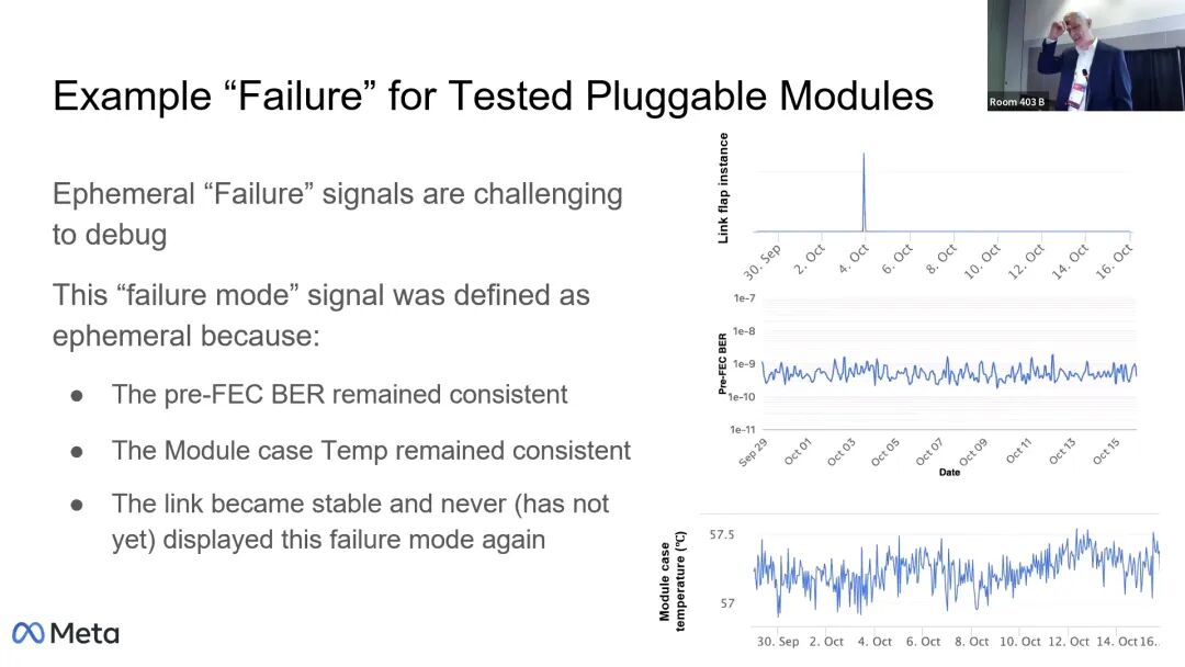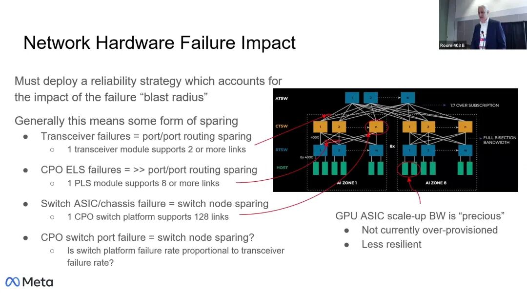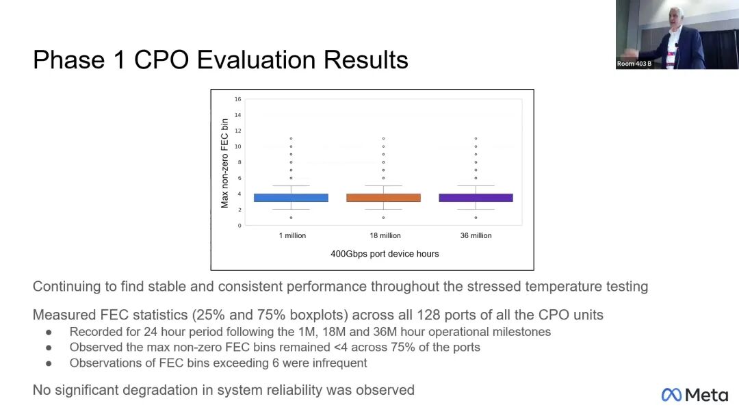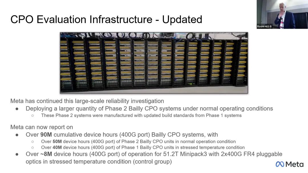 2. 针对观众提出的“CPO与可插拔模块的可靠性对比是否为公平的同条件对比,若可插拔模块也完成与交换机的联合测试,MTBF是否会有显著变化”问题,Meta回应称,这个问题本质上和链路训练的影响类似,100G每通道规格下目前没有对应的链路训练机制,200G规格下的链路训练可能会带来可插拔模块链路稳定性的提升,最终结果需要数据验证。同时,本次测试得到的数据,与Meta在实际数据中心集群中观测到的运行数据高度相关,测试场景完全复现了Meta实际部署的标准流程,测试结果具有代表性,能够反映真实部署场景下的可靠性表现。如果后续链路训练等技术能带来可插拔模块的可靠性提升,Meta也会同步跟进测试与部署。