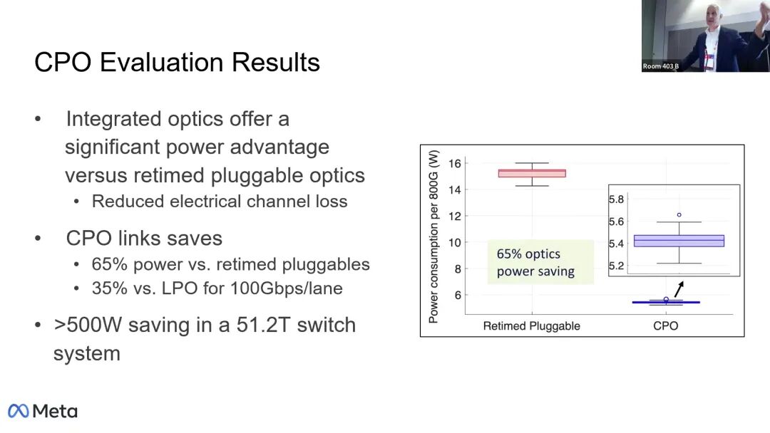- 100Gbps每通道规格下,对比线性直驱光模块(LPO),CPO系统仍实现35%的功耗降低,进一步验证了集成架构的能效优势;