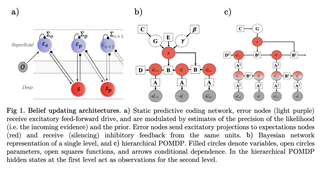 这为我们提供了一组三个常微分方程,描述了三个类神经元节点的行为,其动力学在变分自由能上进行梯度下降。这为我们提供了一个简单的神经元动力学模型,该模型近似于隐藏状态的后验分布。这些方程与皮层微回路之间的映射是一个正在进行的研究课题。然而,广义上讲,隐藏状态的动力学(在“期望节点”中实现)通常与皮层的深层相关联,这些深层横向投射到同一皮层层级浅层的误差节点,并向后投射到下级皮层层级浅层的误差节点。预测误差动力学(在“误差节点”中实现)通常与皮层的浅层相关联,这些浅层横向投射到同一皮层层级深层,并向前投射到该层级更高层的深层(图1a)。每个层级的期望节点作为其上一层的观测值,并作为其下一层的先验(综述和讨论见 Bastos et al., 2012; Hodson et al., 2023; Shipp, 2016; Walsh et al., 2020)。