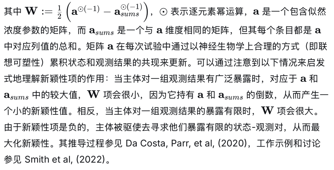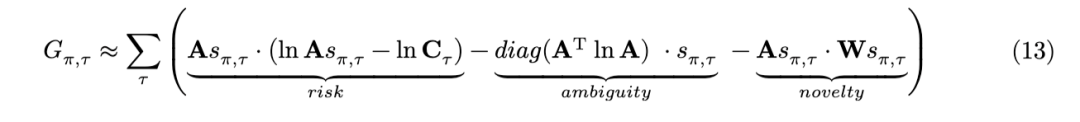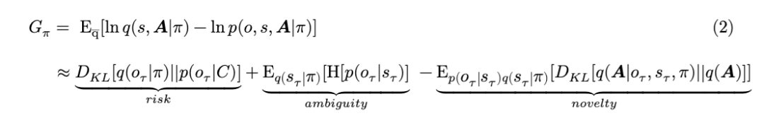 方程2的第二行展示了将期望自由能分解为其最直观的组成部分:风险、模糊性和新颖性。由于推导过程较为复杂,我们建议感兴趣的读者参考 (Da Costa, Parr, et al., 2020) 的附录。