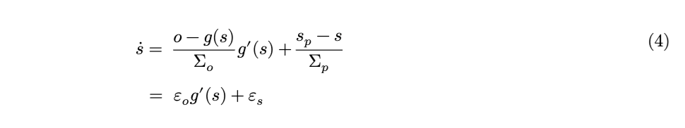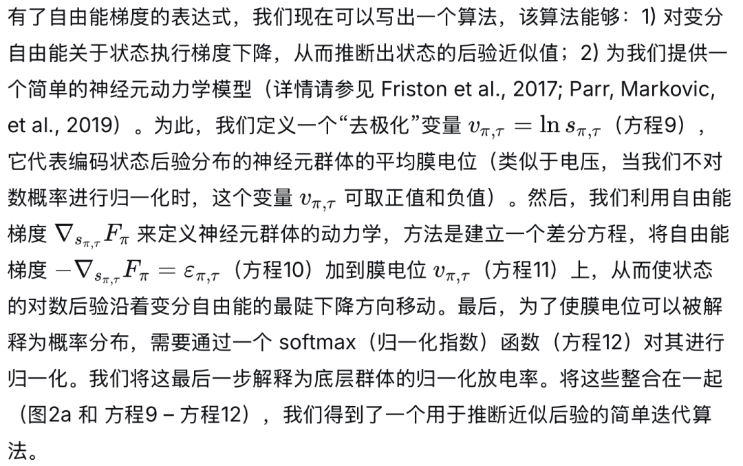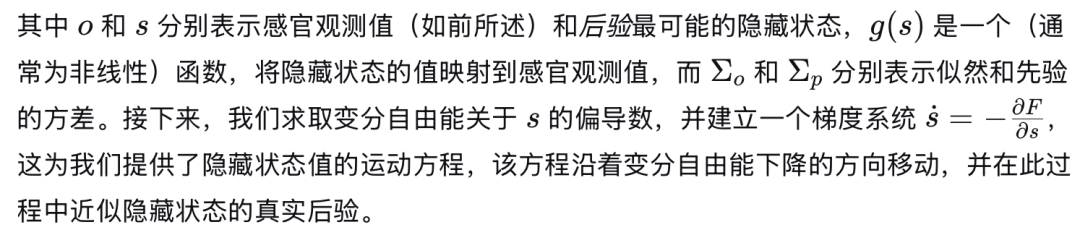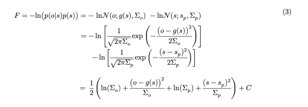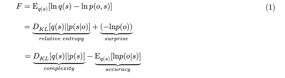 变分自由能(公式1)是,在近似后验分布 (q) 下,近似后验的对数与生成模型 (p) 的对数(即观察结果 (o) 与其原因——或隐藏状态 (s) ——的联合概率)之间的期望差异。近似后验反映了在给定感官数据的情况下,对世界隐藏状态的推断结果。